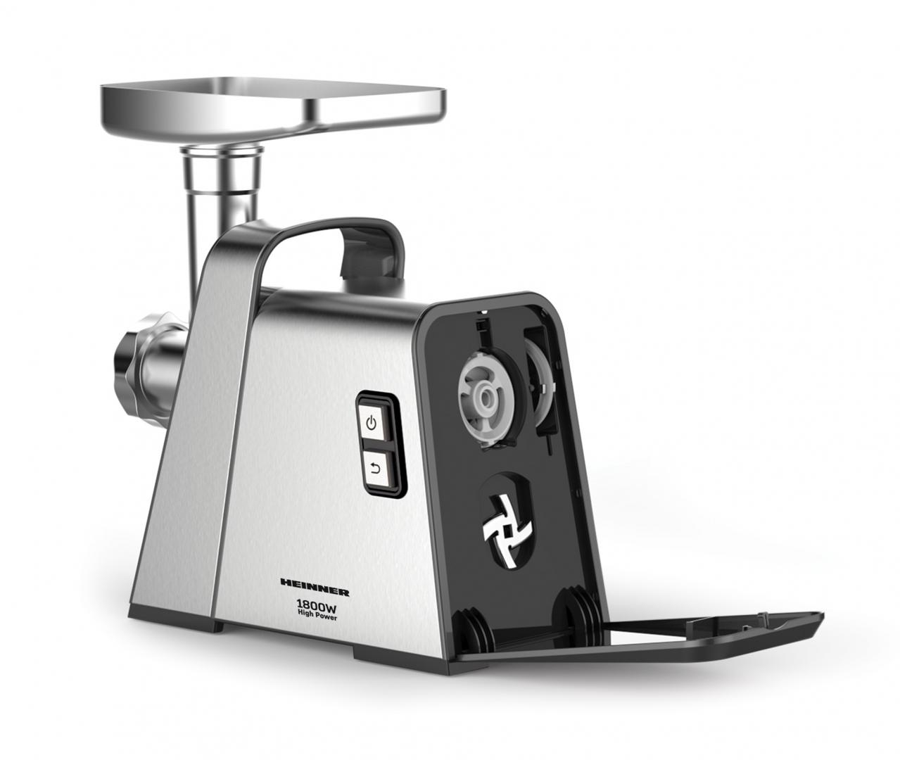 Masina de tocat Heinner MG-Y1800X, Putere maxima 1800 W, Angrenaje metalice, Cutit din inox, Funcție Reverse, 3 site de taiere, Spatiu depozitare accesorii, Negru/Inox
