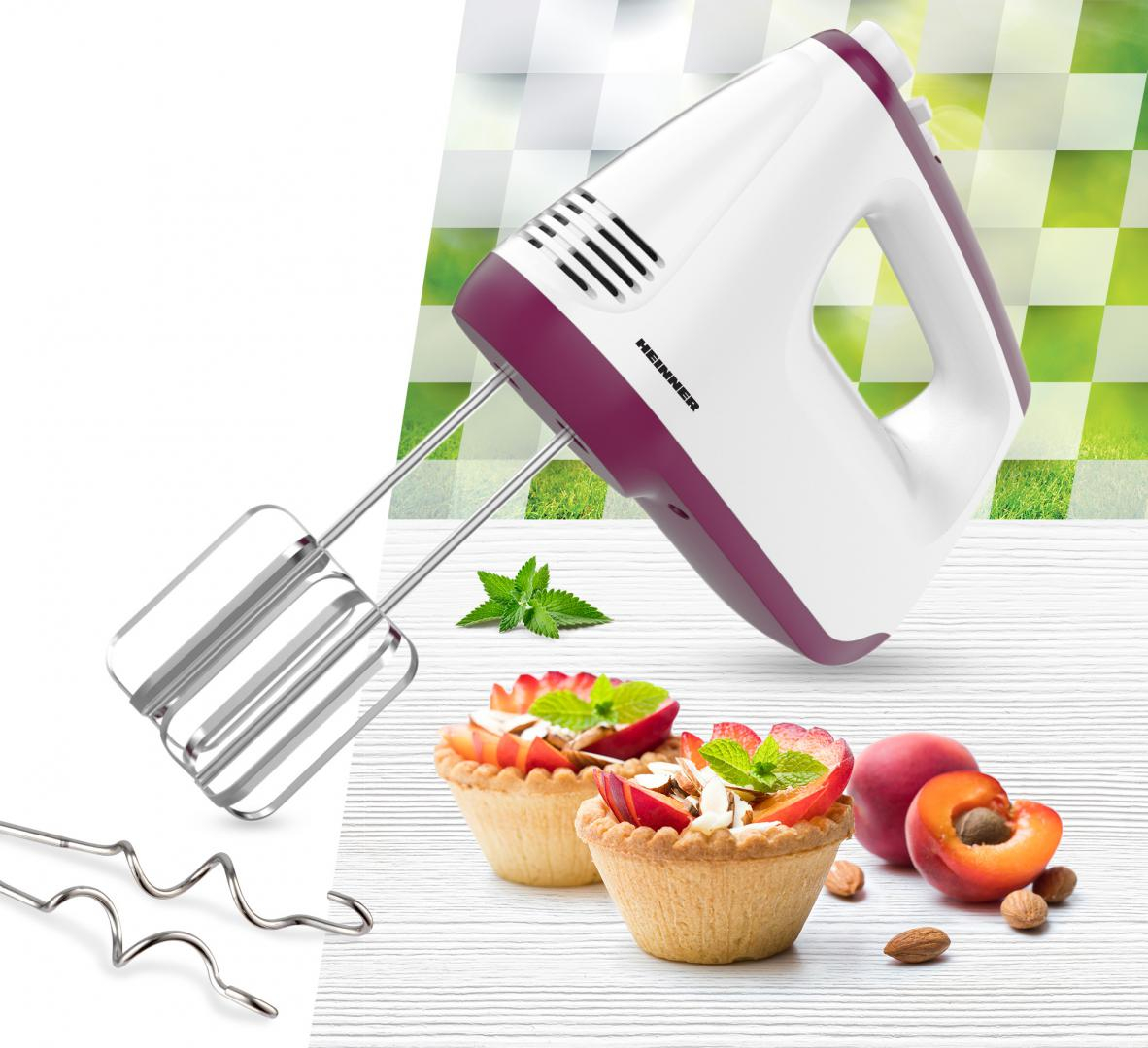 Mixer de mana Heinner HM-400BG, putere: 400w, 2 teluri si 2 carlige din inox, 6 viteze + turbo, self stand, alb/burgundy
